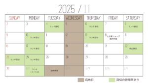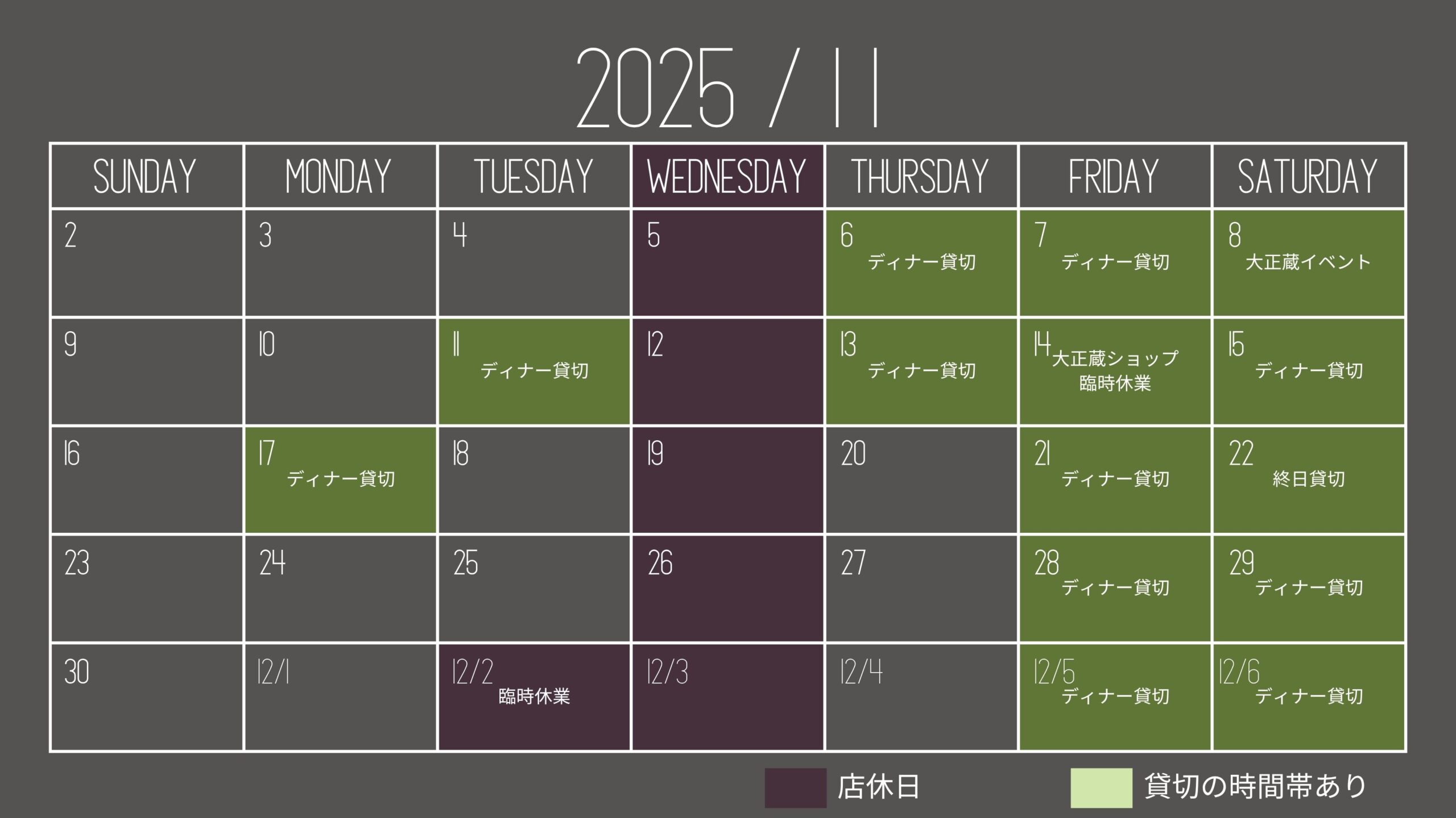若鶴酒造のレストラン【竈flamme炭三郎】より11月営業日のご案内でございます。
