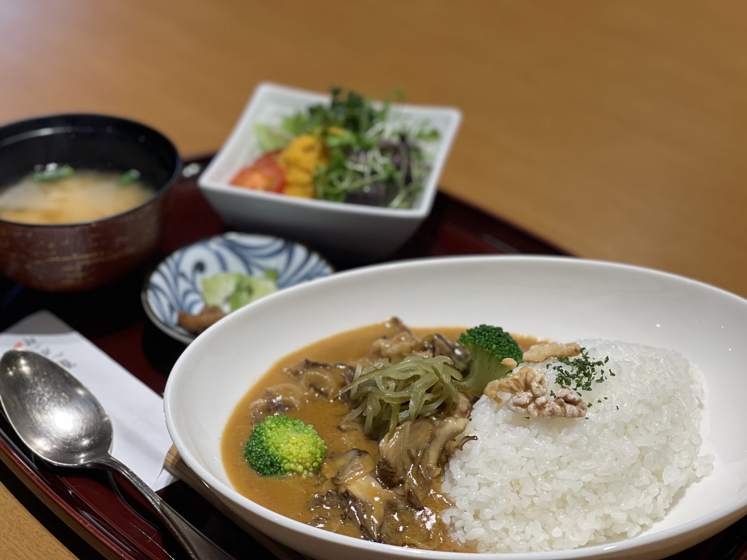 砺波野たまねぎと和牛の牛すじ肉を使ったコク豊かなカレーです。若鶴酒造の酒粕を加えることで奥深い味わいに仕上げました。特製ドレッシングのサラダと酒粕汁のセット。